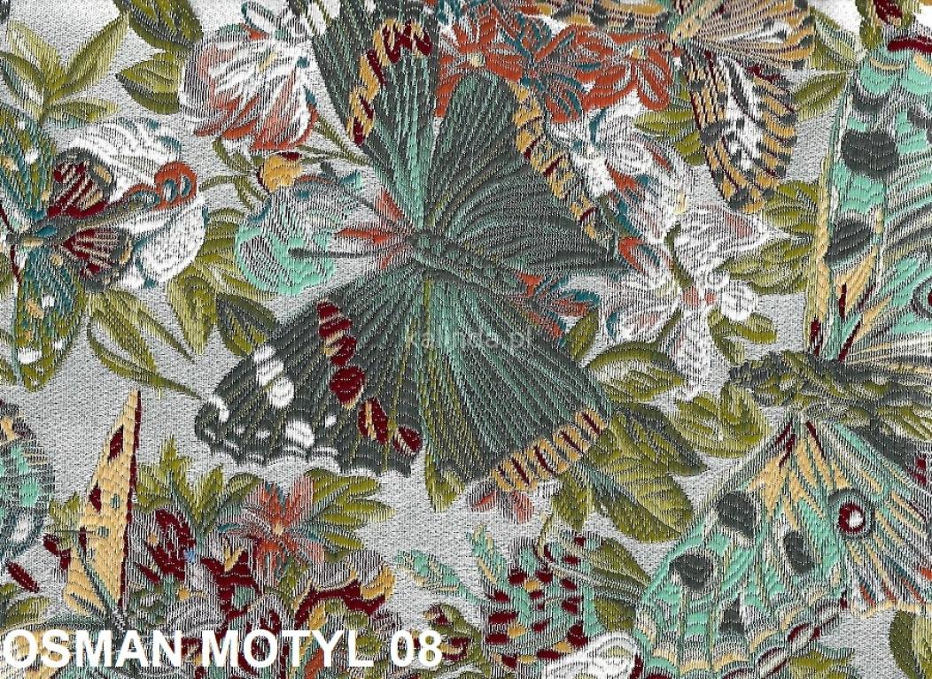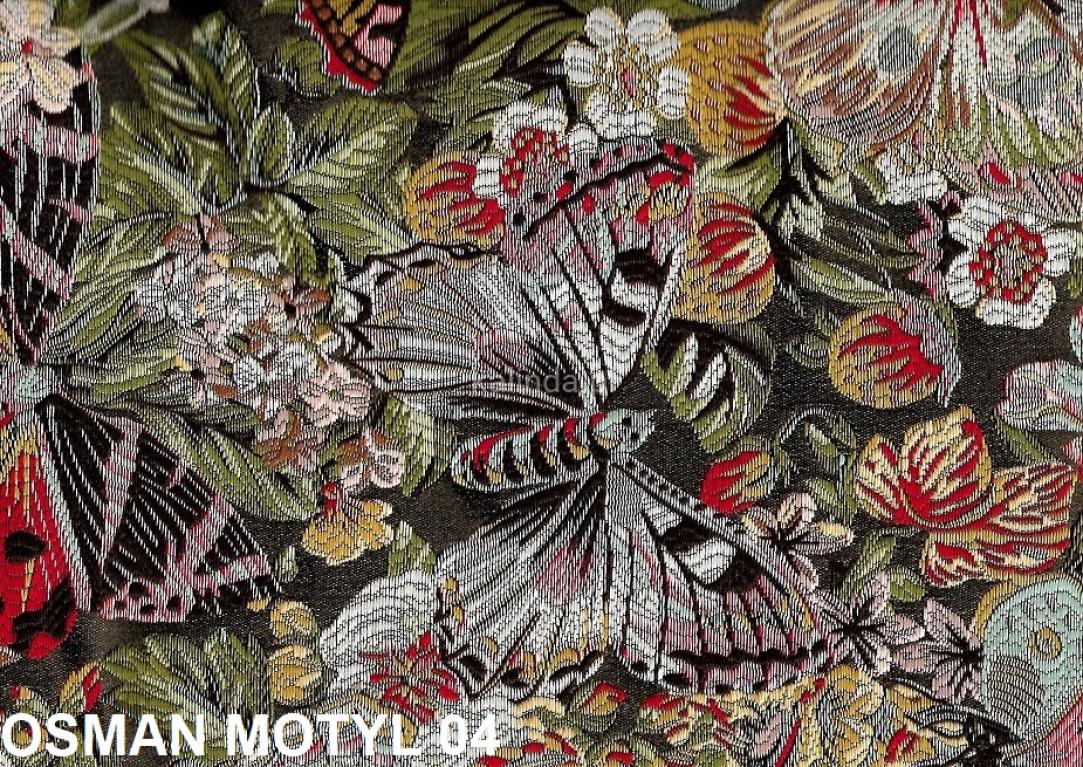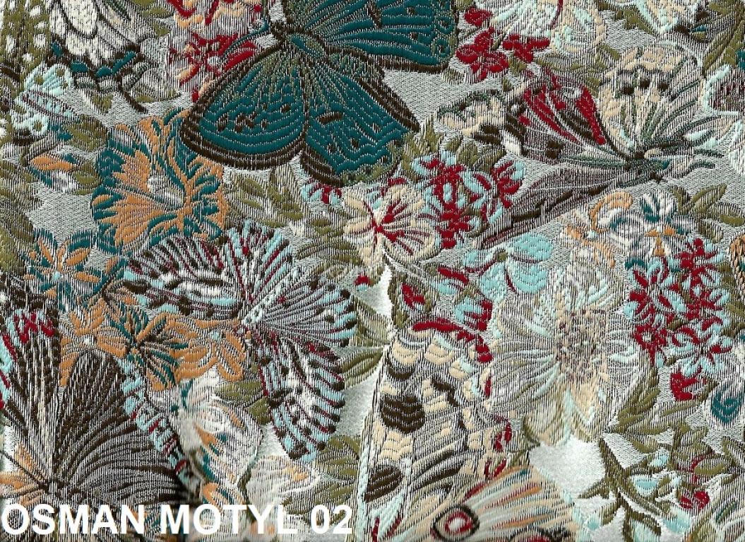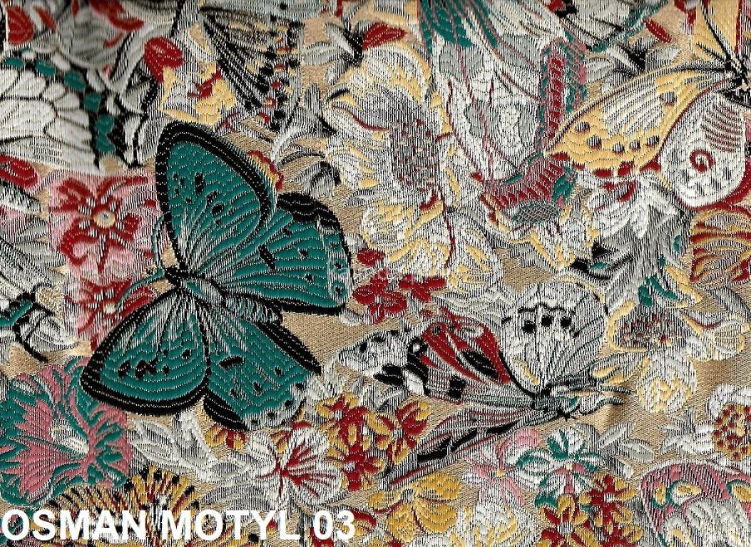OSMAN Motyle - miękka, żakardowa tkanina obiciowa z orientalnym wzorem we wspaniałe barwnie "wyszyte" motyle na błyszczącym tle. Tkanina pięknie prezentuje się na meblach stylowych jak i nowoczesnych, sofach, szezlongach, kanapach, fotelach, poduszkach itp. Może być również wykorzystana jako tkanina dekoracyjna.