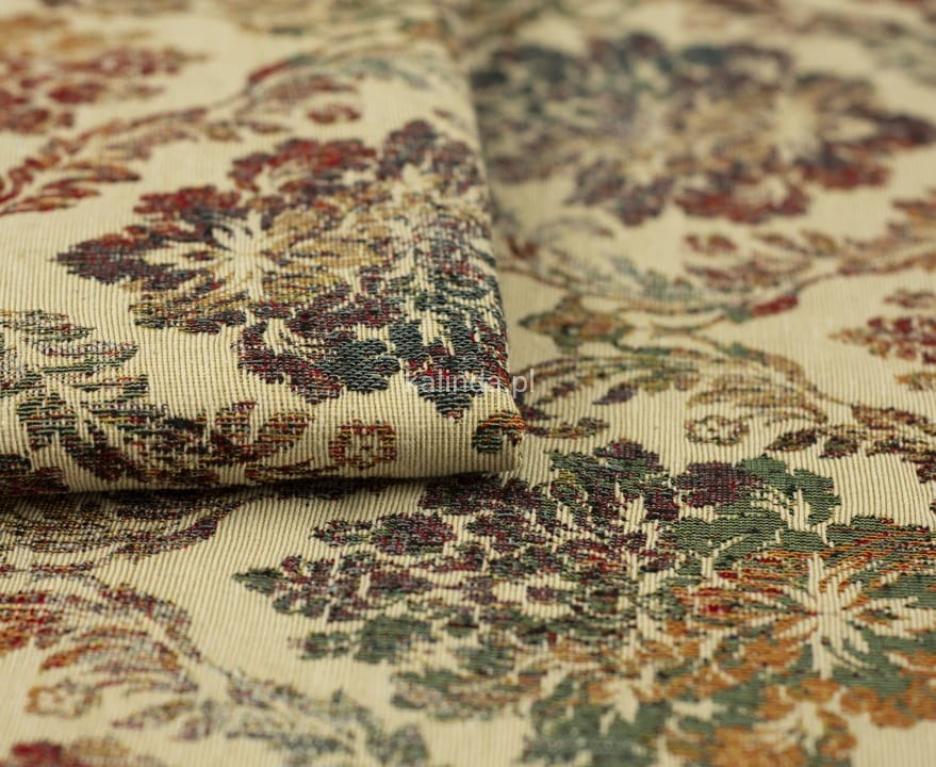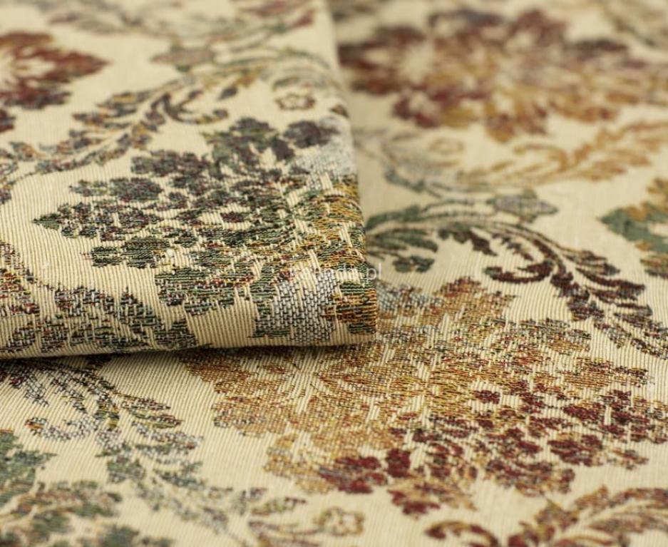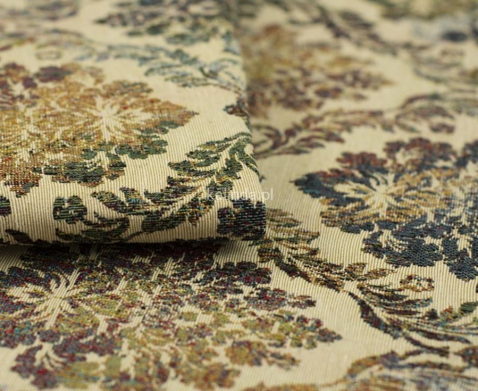MEDALIONY, kolekcja tkanych żakardowych tkanin meblowych ze wzorem stylowych medalionów na tle imitującym len. Żółte nitki w lekko błyszczą, dodając elegancji. Materiał obiciowy miękki w dotyku, szybko schnący, o ekstremalnej trwałości wspaniale będzie się reprezentować na meblach stylowych i nowoczesnych a także poduszkach czy zasłonach lub obrusach.