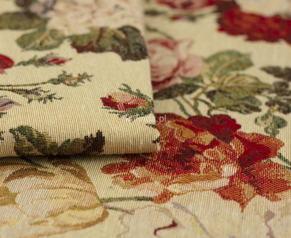 RÓŻA ANGIELSKA, kolekcja tkanych żakardowych tkanin meblowych ze wzorem czerwonych róż na tle imitującym len. Materiał obiciowy miękki w dotyku, szybko schnący, o ekstremalnej trwałości wspaniale będzie się reprezentować na meblach stylowych i nowoczesnych a także poduszkach czy zasłonach lub obrusach.