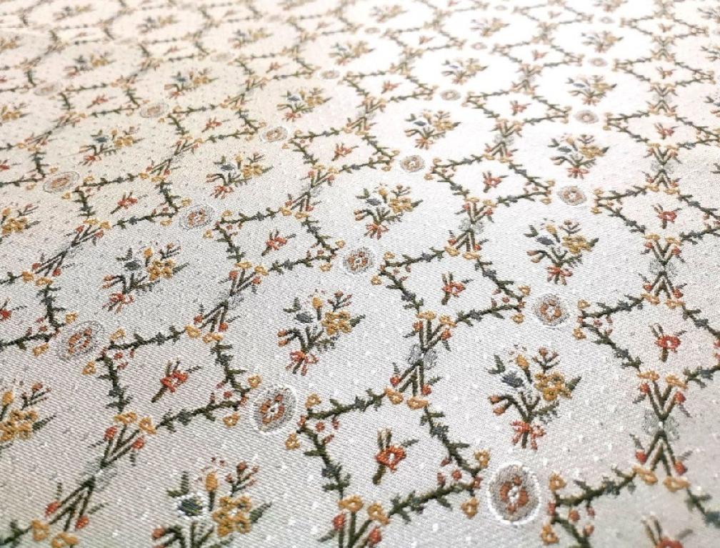 PIANO - żakardowa tkanina meblowa z eleganckim, delikatnym motywem kwiatowym. PIANO to materiał tapicerski z domieszką bawełny, charakteryzujący się stonowaną kolorystyką i delikatnym błyszczącym wzorem. Ten rodzaj tkaniny nadaje się do obić sof, foteli, poduszek i zasłon.