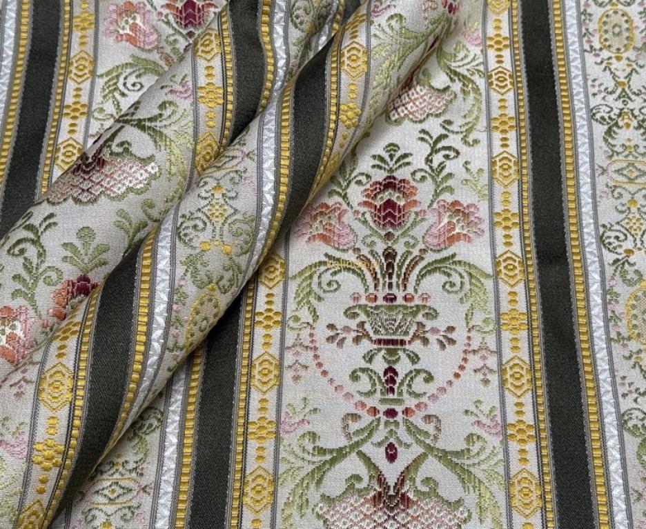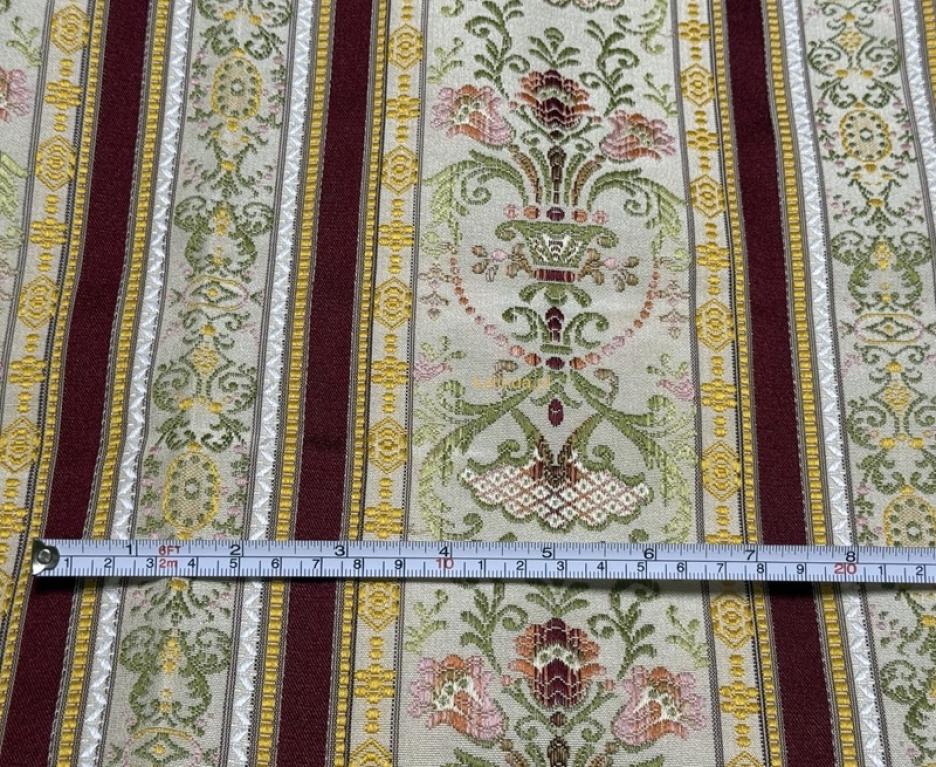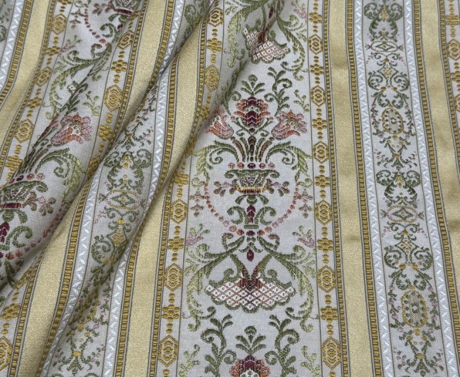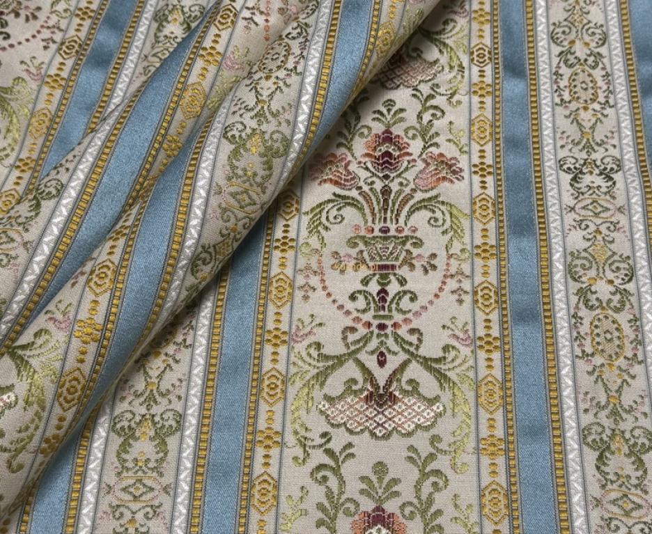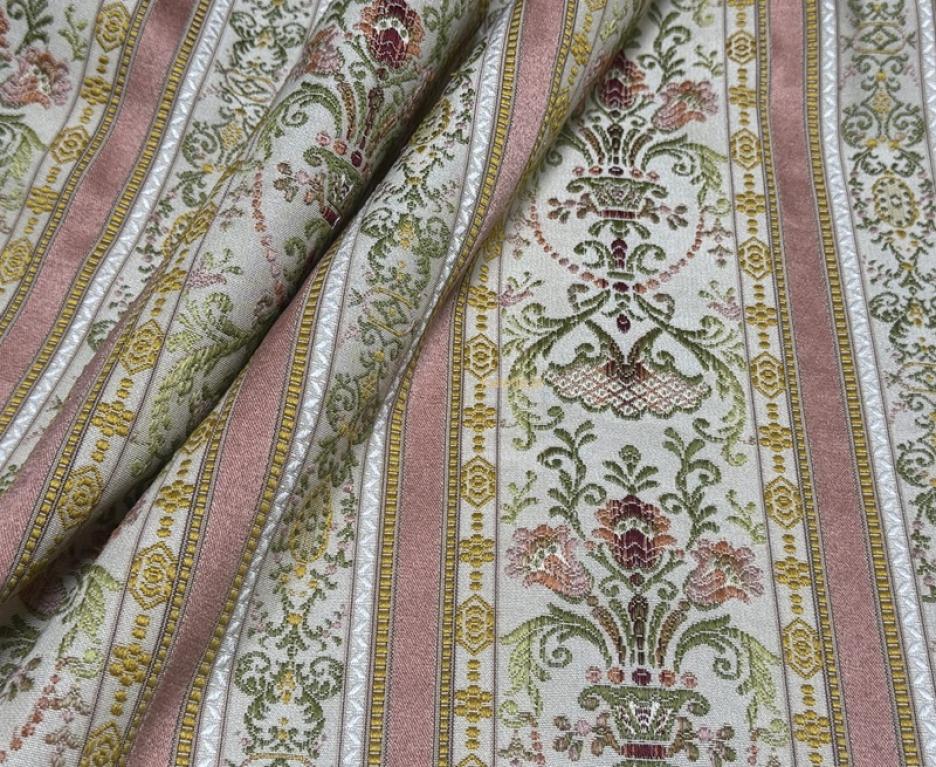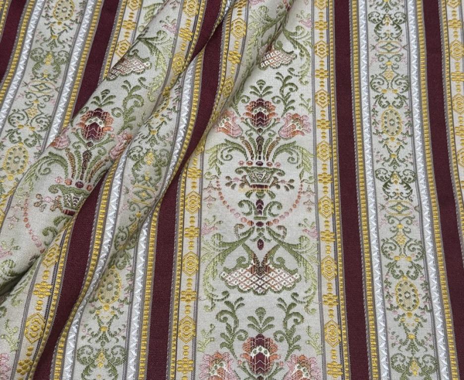 Tkanina BURGUNDRY to dekoracyjny żakard obiciowy o szlachetnym charakterze i wysokiej estetyce wykonania. Wyróżnia się gęstym splotem oraz precyzyjnie tkanym wzorem, który łączy pasy z florystycznymi motywami, tworząc elegancki ornament. Skład materiału – 56% poliester i 44% wiskoza – zapewnia optymalne połączenie trwałości, sprężystości oraz lekko połyskującej powierzchni. Dzięki gramaturze 420 g/mb tkanina dobrze układa się na meblach i utrzymuje swój efektowny wygląd przez długi czas. BURGUNDRY występuje w pięciu szlachetnych wersjach kolorystycznych: bordowej, niebieskiej, zielonej, żółtej i różowej, co ułatwia dopasowanie do różnorodnych aranżacji wnętrz.