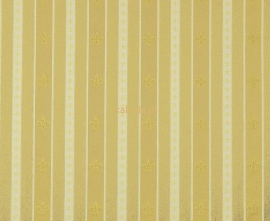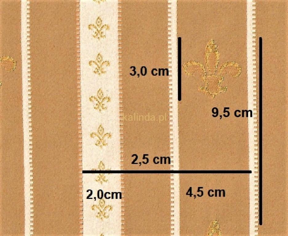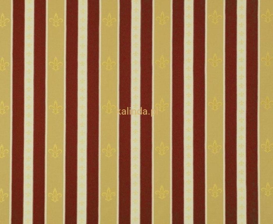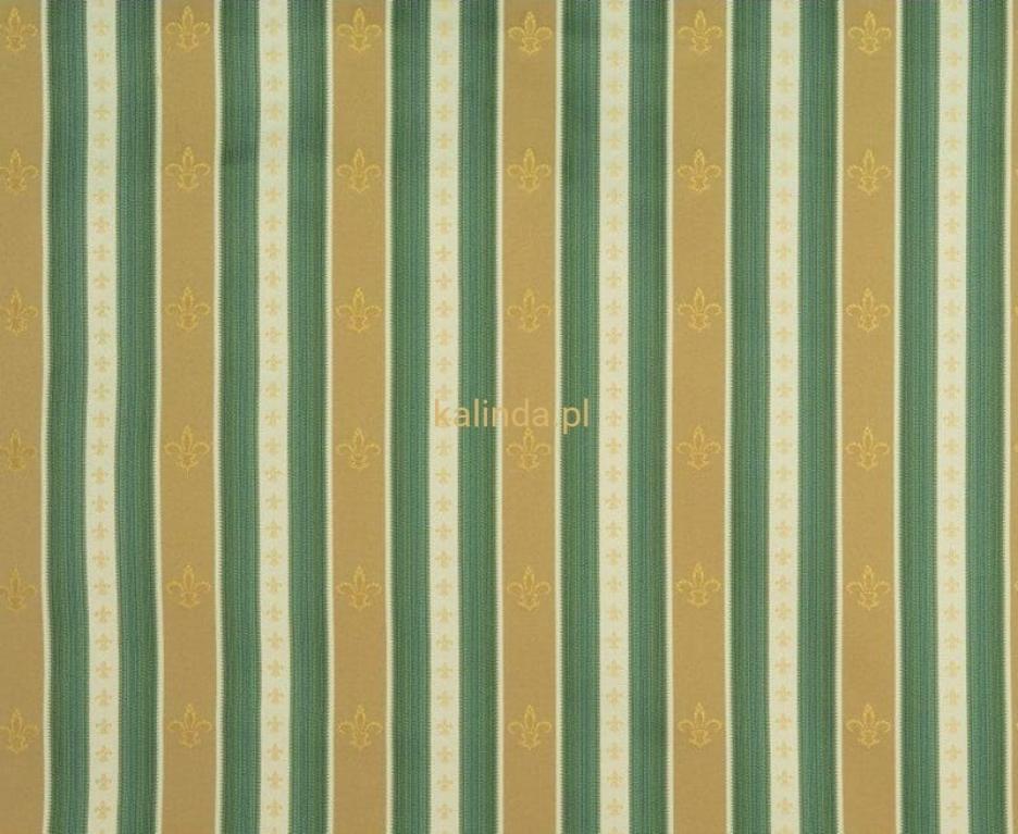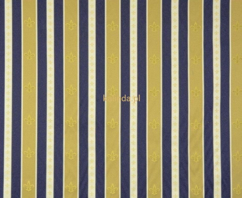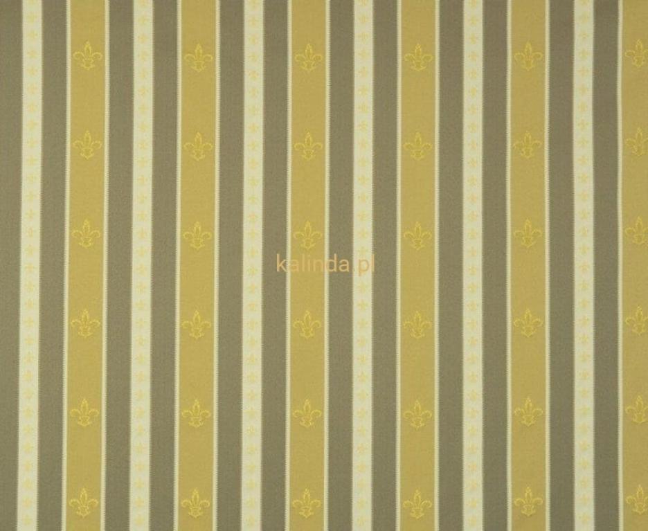 Centralnym elementem wzoru jest stylizowana lilijka wykonana złotą nicią, nawiązująca do klasycznej symboliki fleur-de-lis, kojarzonej z prestiżem, tradycją i luksusem. Ornament jest symetryczny i regularnie powtarzalny, co nadaje całości harmonii oraz wizualnego ładu. Pionowy układ pasów optycznie wysmukla tapicerowane powierzchnie, dzięki czemu tkanina szczególnie efektownie prezentuje się na większych formach mebli wypoczynkowych.